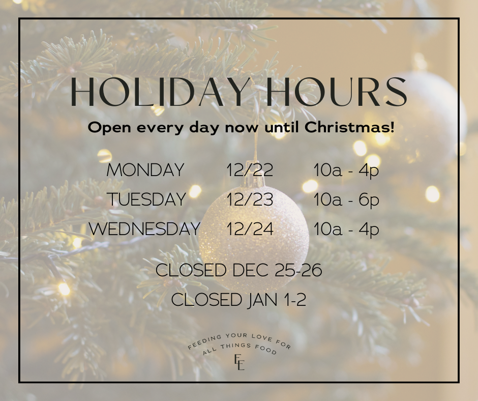 Regular hours week beginning December 15, then special holiday hours the week of Christmas.